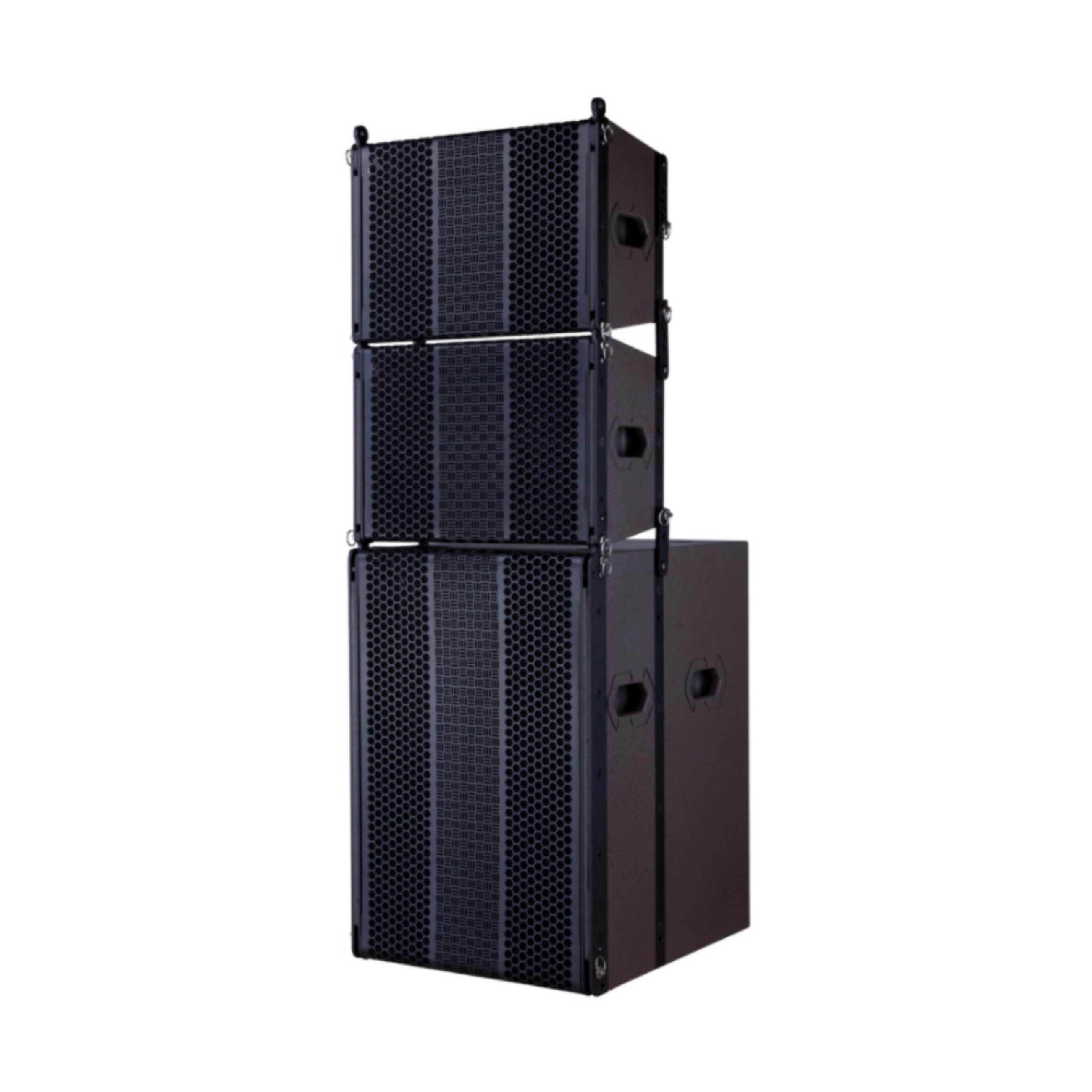 雙12"無源線性陣列全頻箱 1個振膜壓縮高音單元釹磁75芯 2個布邊低音單元180磁75芯,其喇叭單元采用特殊防水性涂料處理。箱體選用高品質多層夾板制造,表面采用抗撞漆和露天防護漆(黑色防水型耐磨聚脲高檔噴漆)處理。音箱前面采用堅硬的金屬網罩保護,網罩內側附有透聲防塵防水棉。側面板均有把手,方便使用。