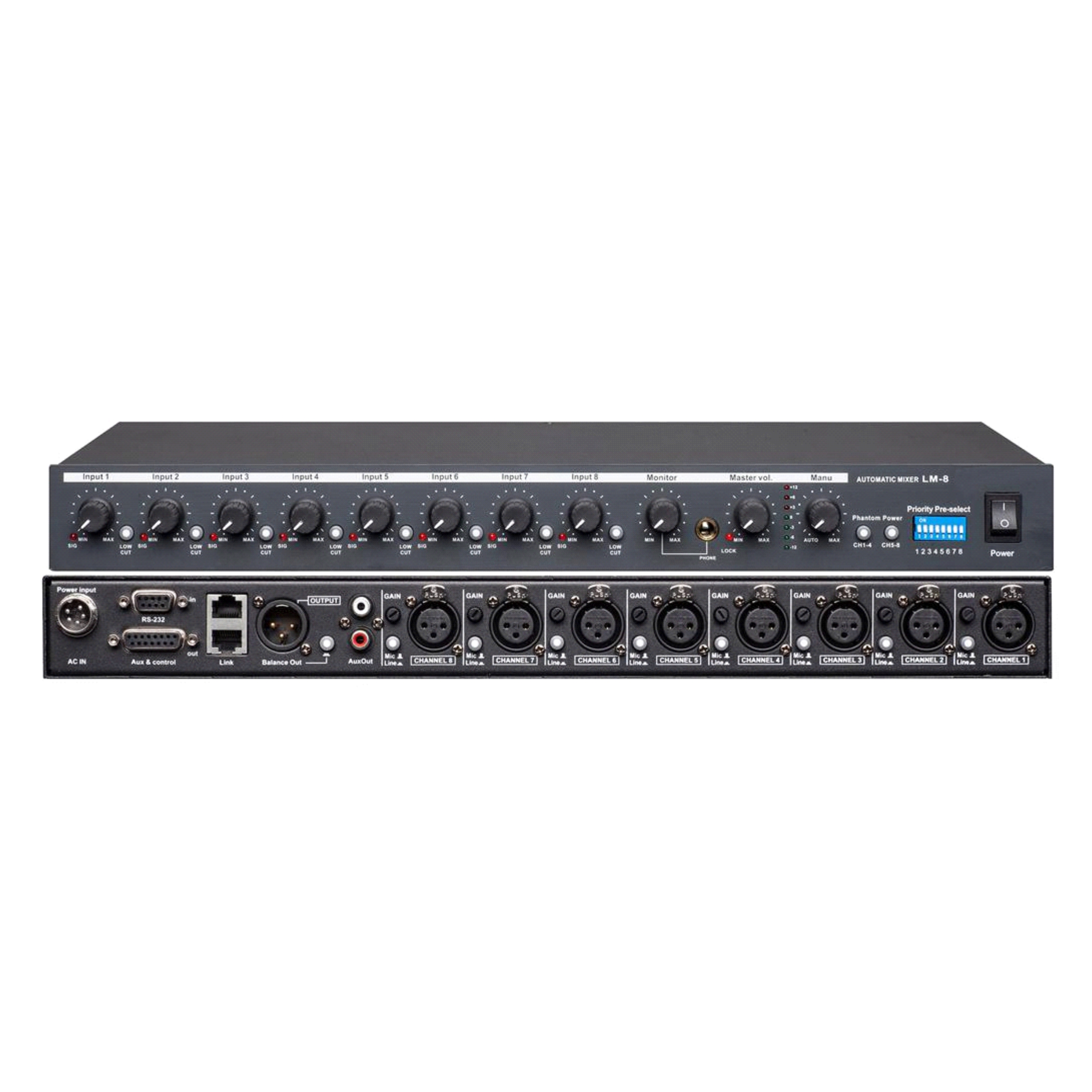 混音器 DK-8·8通道自動(dòng)話筒/線路輸入,或者輔助輸入·自動(dòng)門(mén)限設(shè)置 ·48V幻象電源可選為通道1-4 或者通道 5-8提供·每一個(gè)通道內(nèi)置壓限器防止個(gè)別通道過(guò)載現(xiàn)象·每一個(gè)通道低切開(kāi)關(guān)可調(diào)·超低本地噪聲·平衡輸入和輸出,任意輸入輸出通道 話筒/線路電平選擇開(kāi)關(guān)·任意輸入通道輸入增益控制·可切換手動(dòng)模式優(yōu)先自動(dòng)模式功能·主輸出電平控制帶LED顯示·可調(diào)節(jié)電平監(jiān)聽(tīng)耳機(jī)輸出·話筒/線路通道輸入預(yù)控