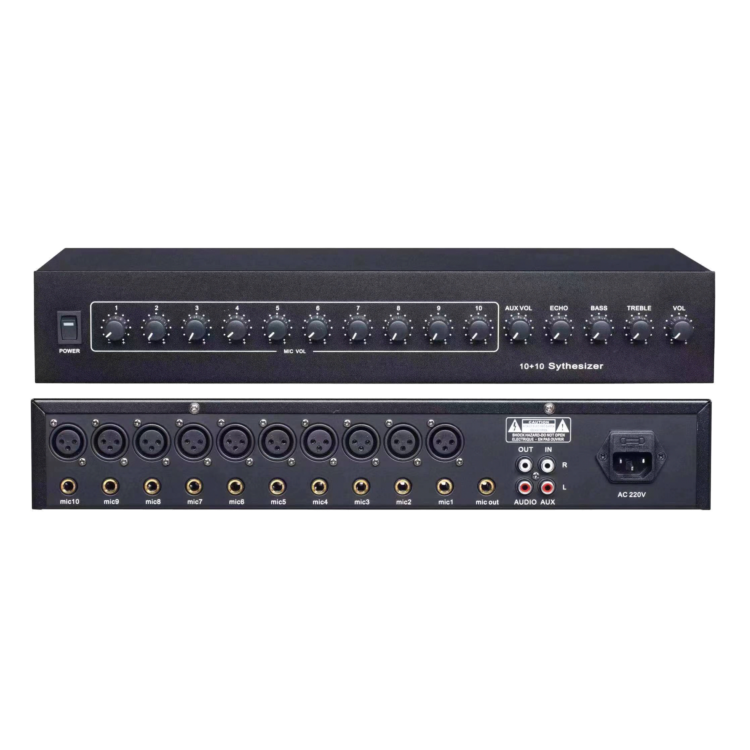 混音器 DK-10十路幻象供電的麥克風(fēng)平衡輸入和十路麥克風(fēng)不平衡輸入共二十路麥克風(fēng),可同時使用的高品質(zhì)混音系統(tǒng)。能適配各種麥克風(fēng)的輸入,獨(dú)特的前置運(yùn)放線路音質(zhì)豐富、清晰明亮;先進(jìn)的數(shù)碼混響對聽眾更具吸引力。外接音頻信號獨(dú)立調(diào)節(jié)。設(shè)有麥克風(fēng)合成后獨(dú)立輸出,麥克風(fēng)合成后和外接音頻信號合成轉(zhuǎn)發(fā)立體聲輸出,獨(dú)立的高、低音調(diào)節(jié)令閣下對語音更具選擇性。兩路話筒共一路音量調(diào)節(jié)能使輸出信號等值均衡。主要功能:◆