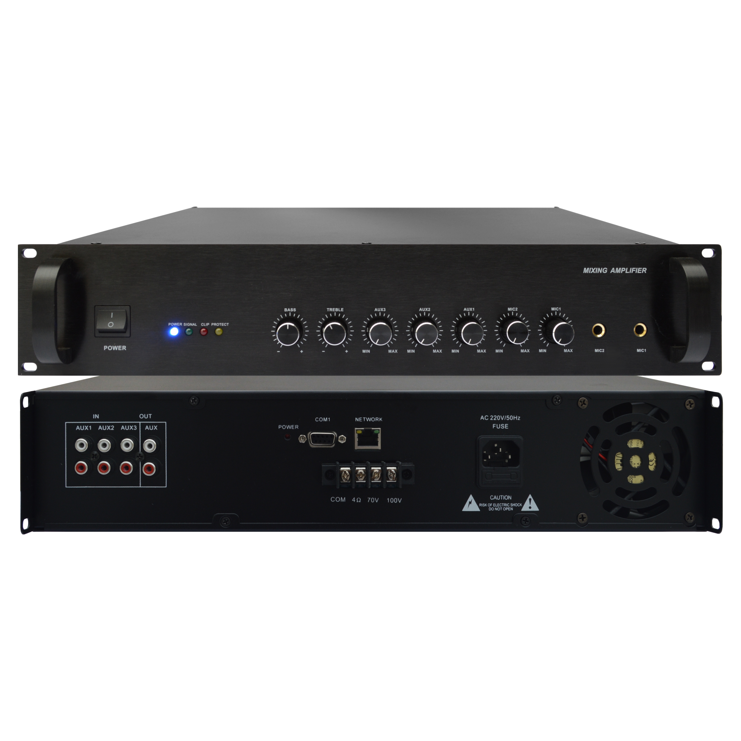 8. 2路話筒輸入(MIC1,2),第一話筒(MIC1)具有最高優(yōu)先,有強(qiáng)切入優(yōu)先功能。
