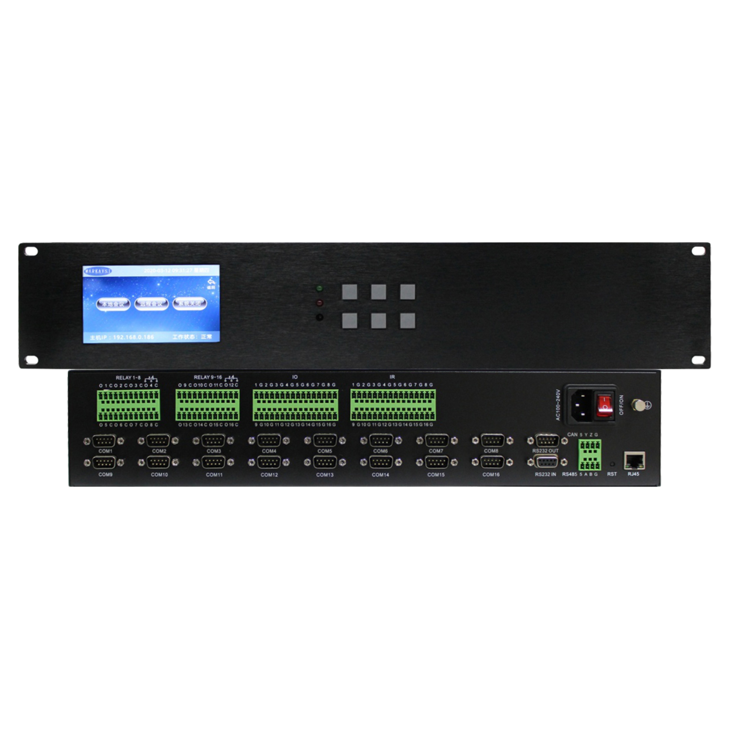 6 前面板顯示采用4.3寸電容觸摸屏,顏色支持65K色,16位RGB,可實(shí)時(shí)顯示主機(jī)IP及中控狀態(tài)、主機(jī)參數(shù)的設(shè)置,也可配合主機(jī)編寫(xiě)邏輯實(shí)現(xiàn)一鍵啟動(dòng)、場(chǎng)景調(diào)用等功能;