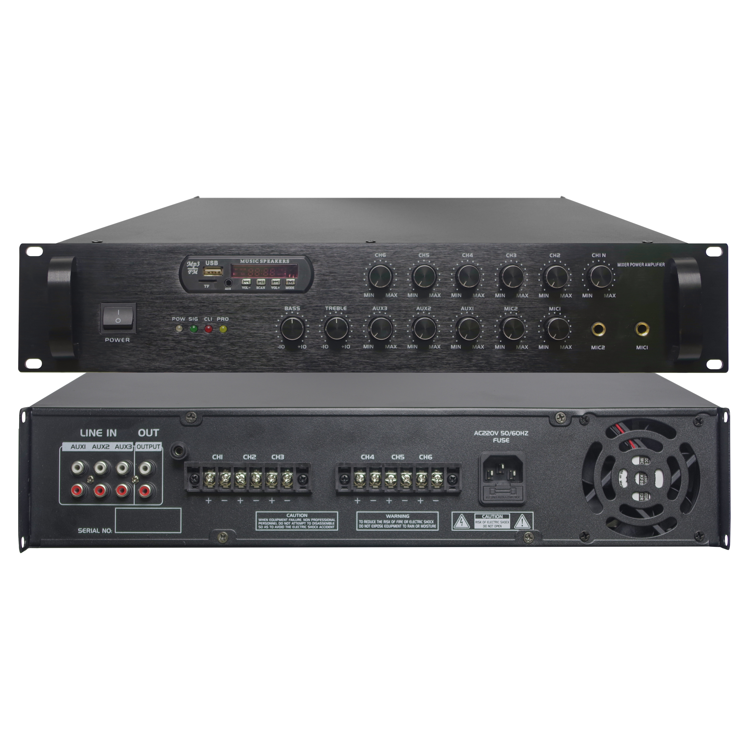2、采用先進(jìn)高效功率放大電路,設(shè)有2路話筒輸入,3路線路輸入,1路輔助輸出;