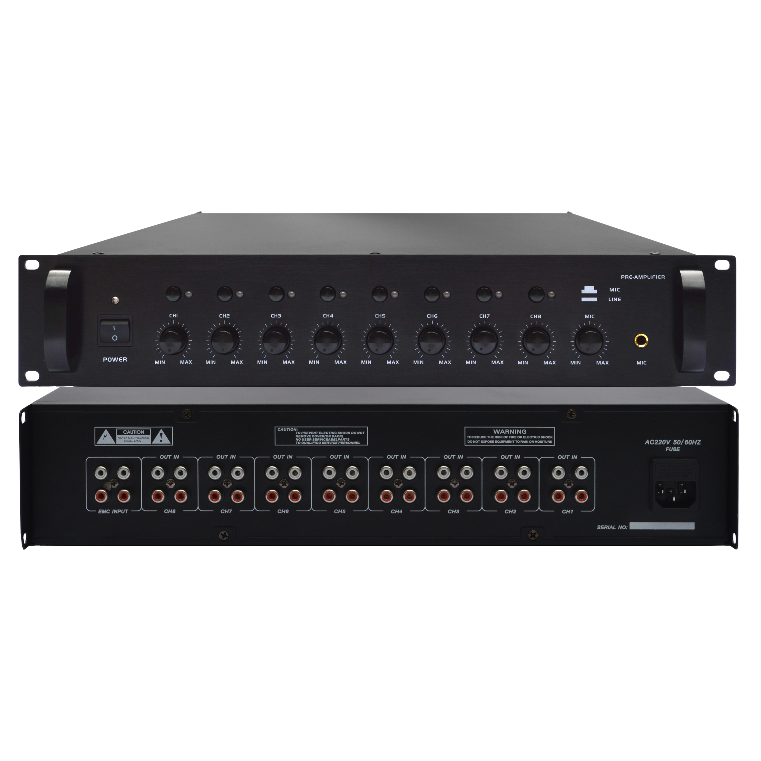 1、設有8組獨立輸入,輸出放大通道,每一通道均可調(diào)校音量