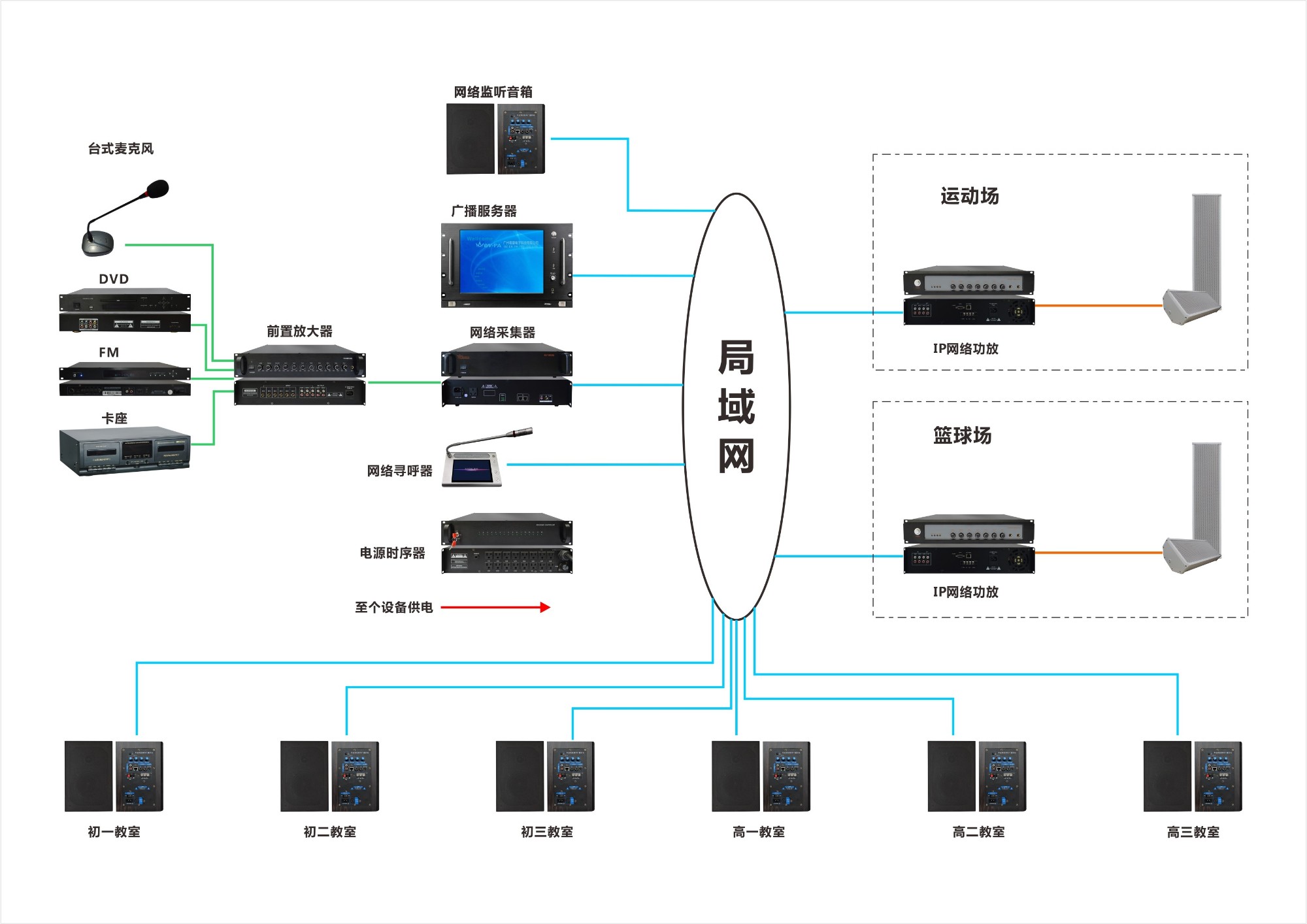 3、廣播系統(tǒng)滿足廣播、多媒體教學(xué)、消防聯(lián)動(dòng)等多種功能,完善了學(xué)校的教學(xué)管理。
