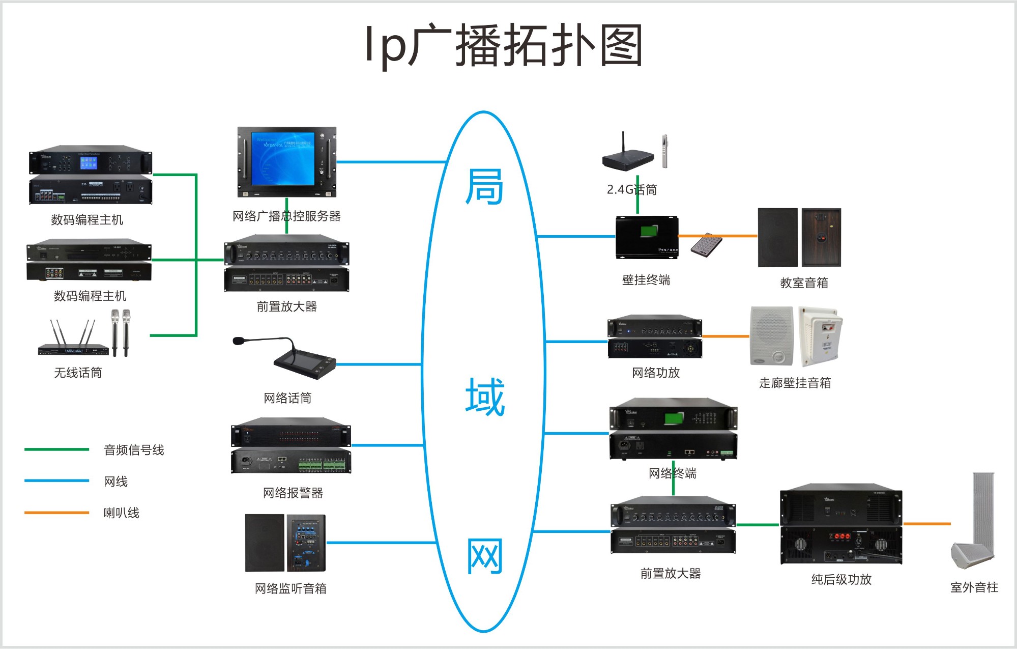 數(shù)字化IP網(wǎng)絡(luò)廣播是建立在網(wǎng)絡(luò)平臺(tái)上,采用網(wǎng)絡(luò)數(shù)字音頻編解碼技術(shù)來(lái)傳輸,解決了傳統(tǒng)廣播系統(tǒng)存在的傳輸距離短,音質(zhì)不佳,維護(hù)管理復(fù)雜,互動(dòng)性能差的問(wèn)題??梢曰诂F(xiàn)有計(jì)算機(jī)網(wǎng)絡(luò)建設(shè),安裝時(shí)無(wú)需單獨(dú)布線。在網(wǎng)絡(luò)應(yīng)用方面,可以真正實(shí)現(xiàn)音頻廣播、視頻監(jiān)控、計(jì)算機(jī)網(wǎng)絡(luò)的多網(wǎng)合一。學(xué)校的公共廣播主要作用是滿足學(xué)校上下課鈴聲播放、開(kāi)展多媒體教學(xué)、開(kāi)展學(xué)校節(jié)目等使用,滿足學(xué)校開(kāi)展校園廣播、多媒體教學(xué)等,課余時(shí)間播放校園節(jié)目,豐富學(xué)生課外活動(dòng)。